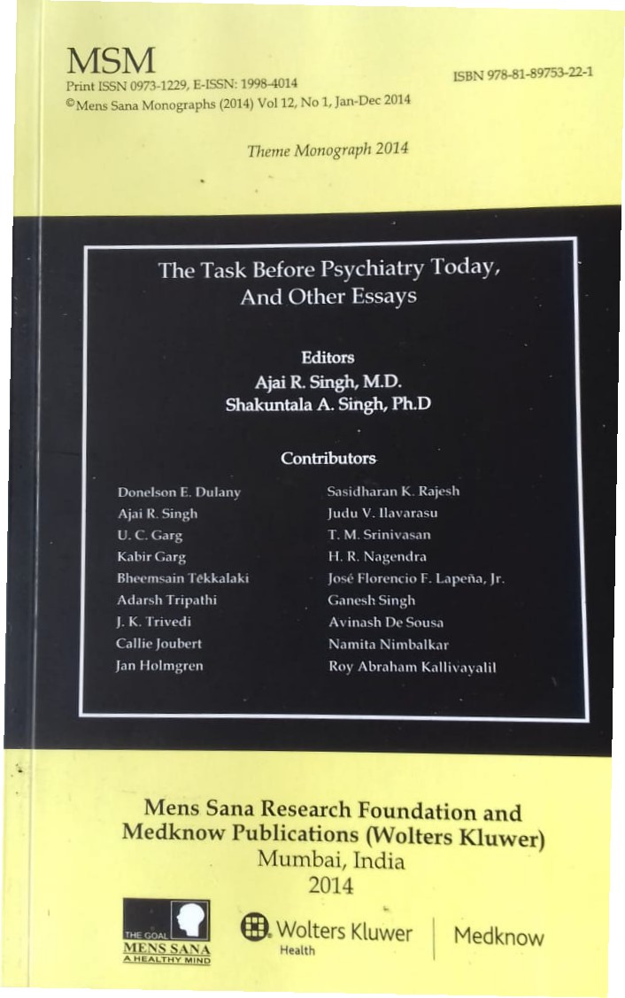4. Bombay Psychiatric Society Presidential Address 20 April 2014. Topic, ‘Blueprint for an Indian Nobel Laureate in Psychiatry’.